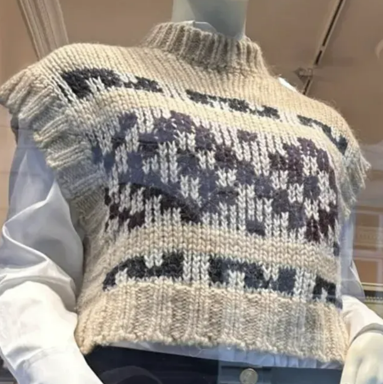 A modern cropped vest with zigzag bands and scattered diagonal motifs